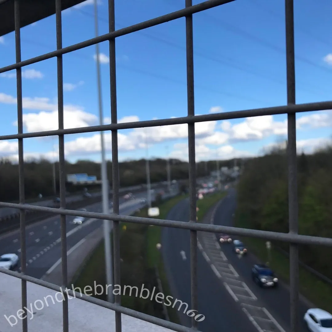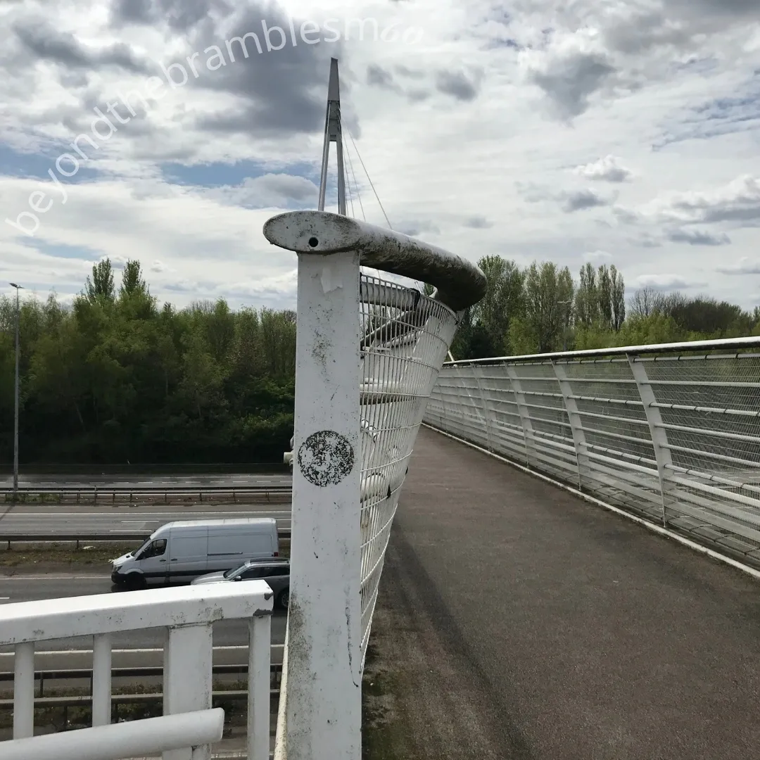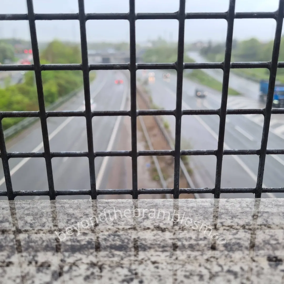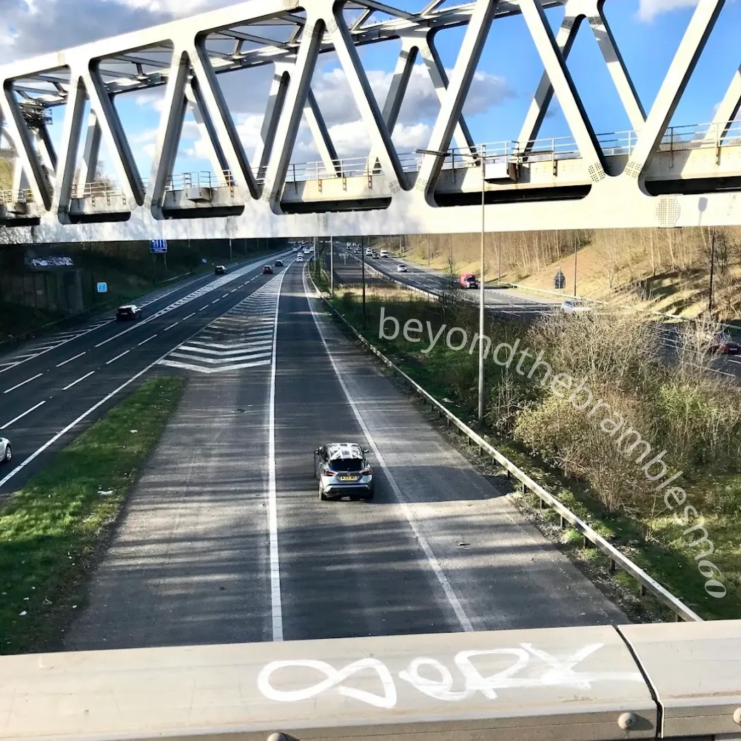 Follow the motorway beside, above, and below—across official and unofficial paths, bridleways, fields, scrubland, housing estates, gated communities, and industrial zones.