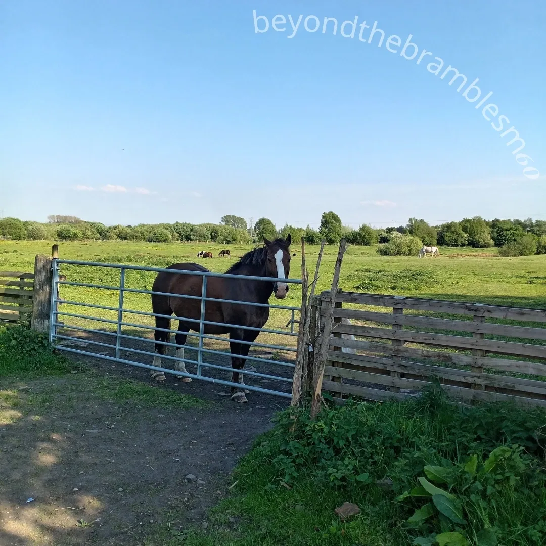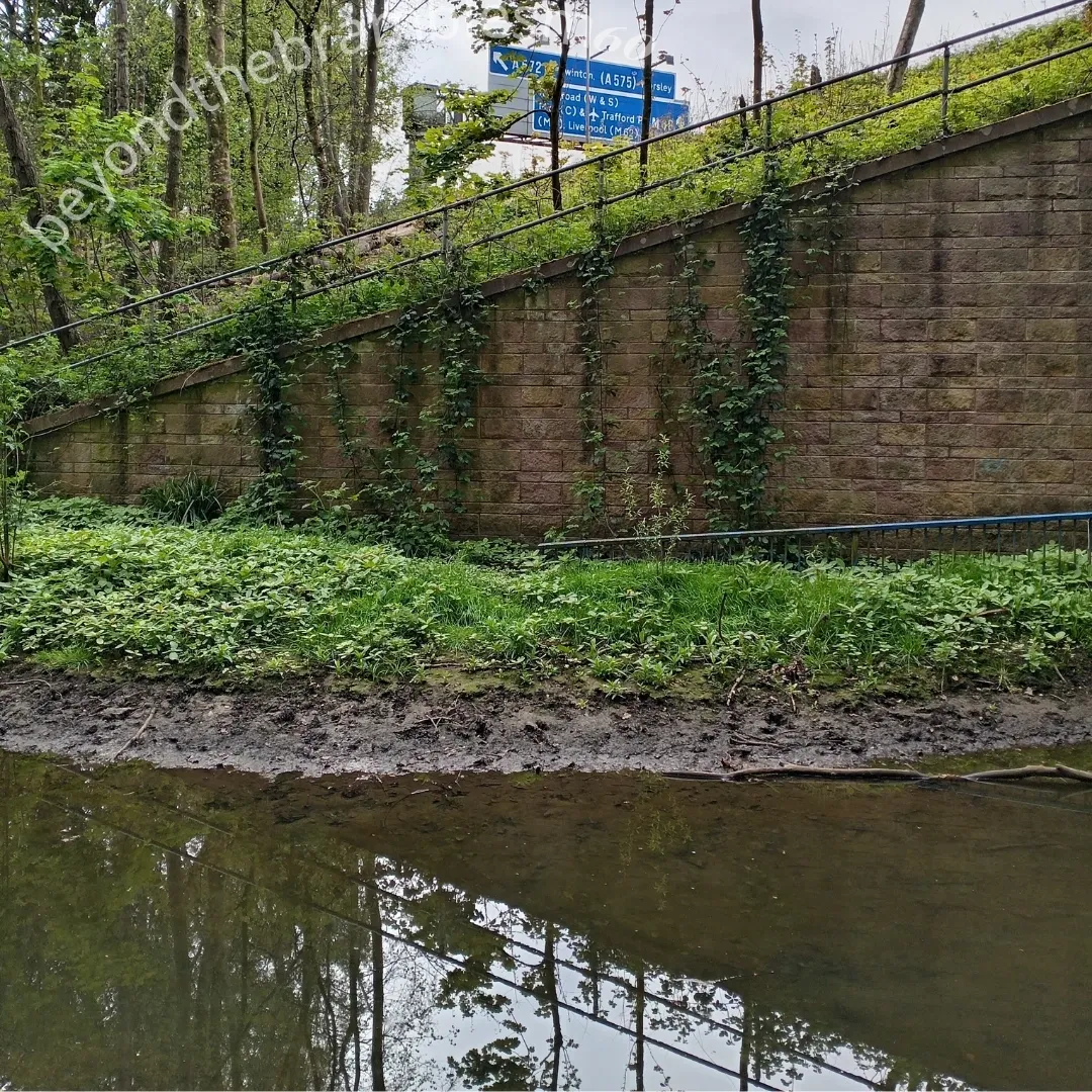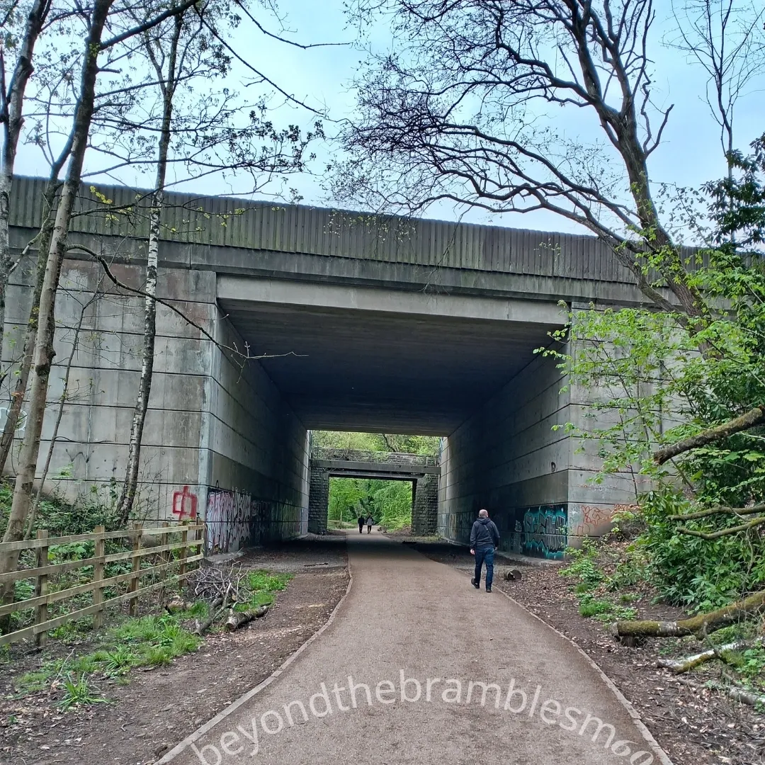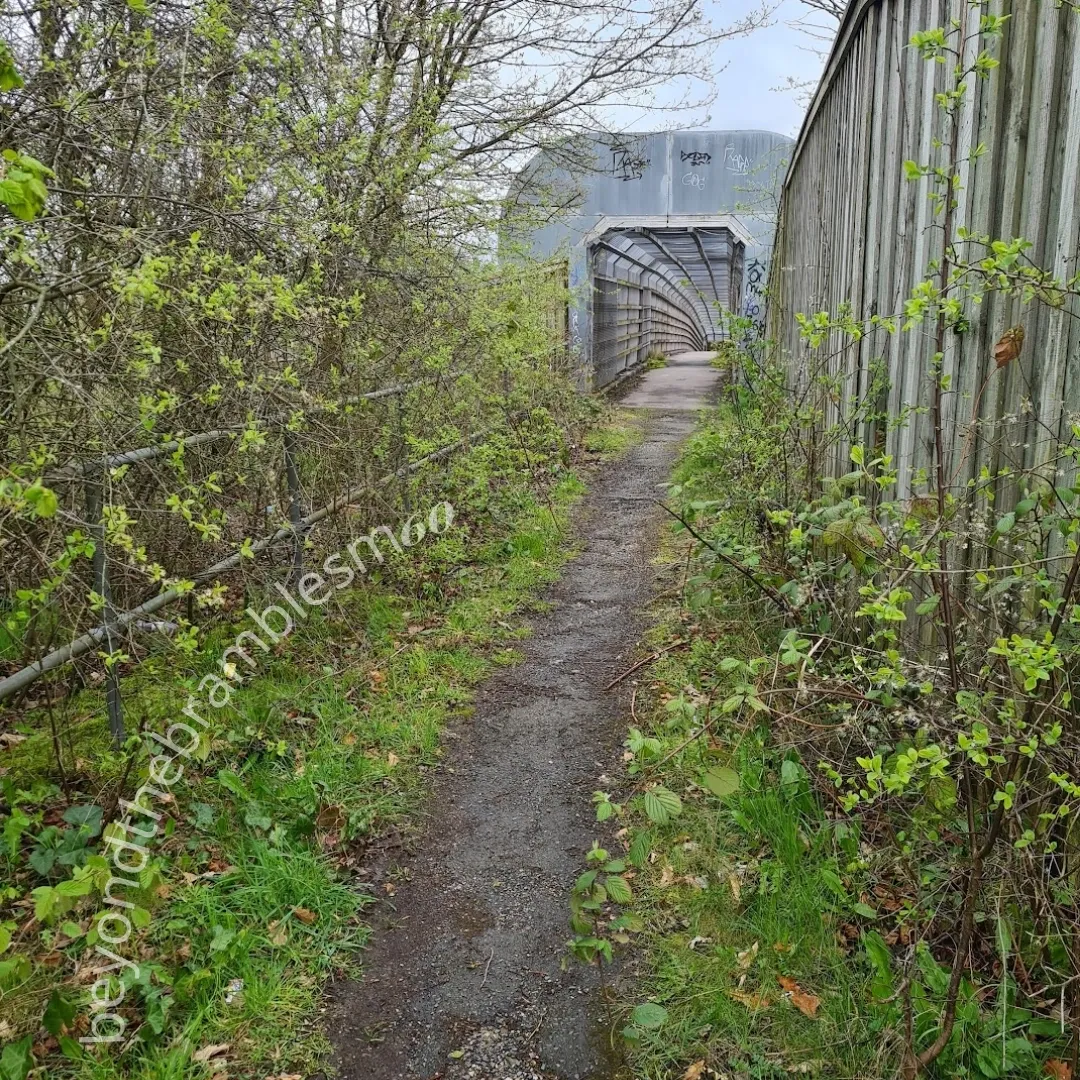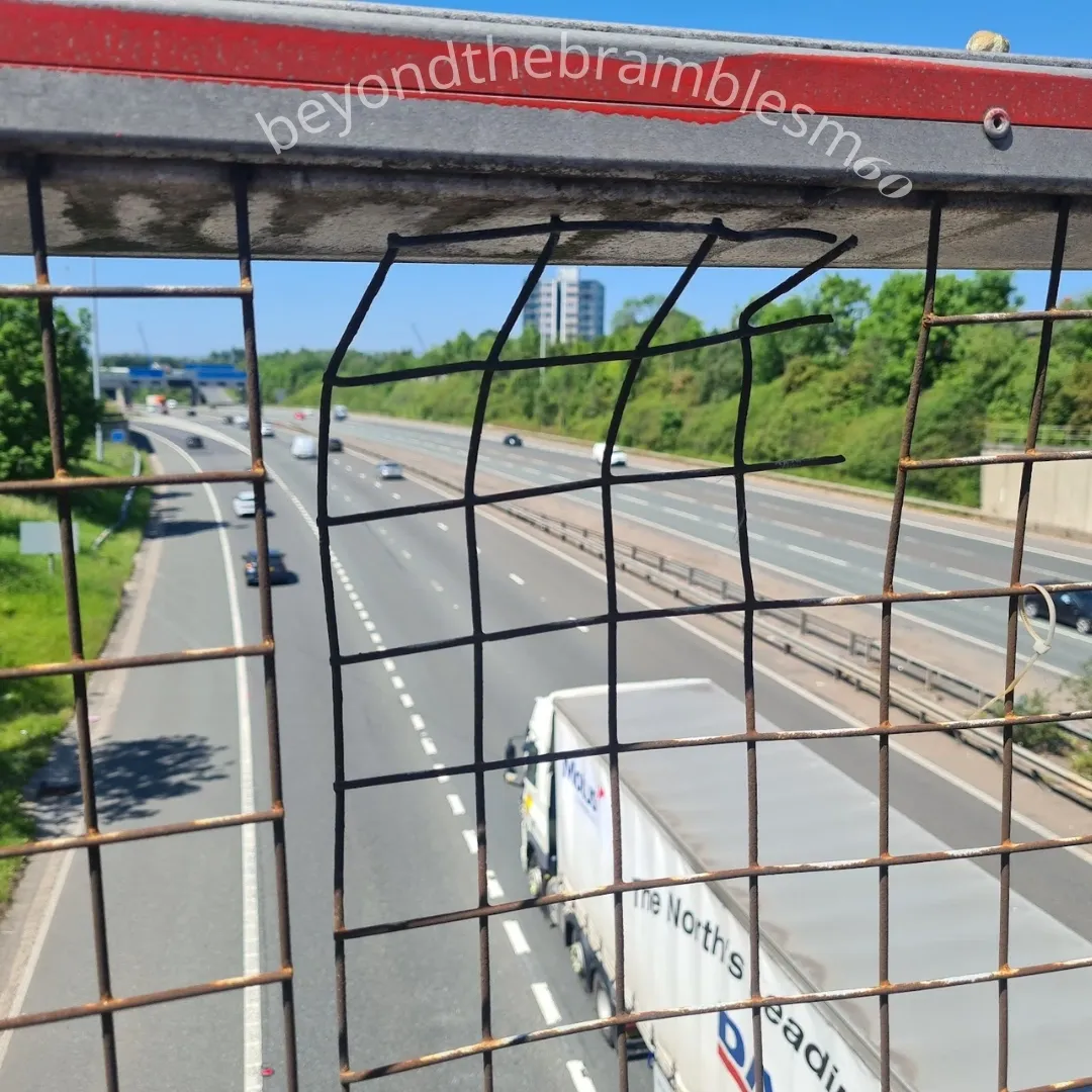Follow the motorway beside, above, and below—across official and unofficial paths, bridleways, fields, scrubland, housing estates, gated communities, and industrial zones.